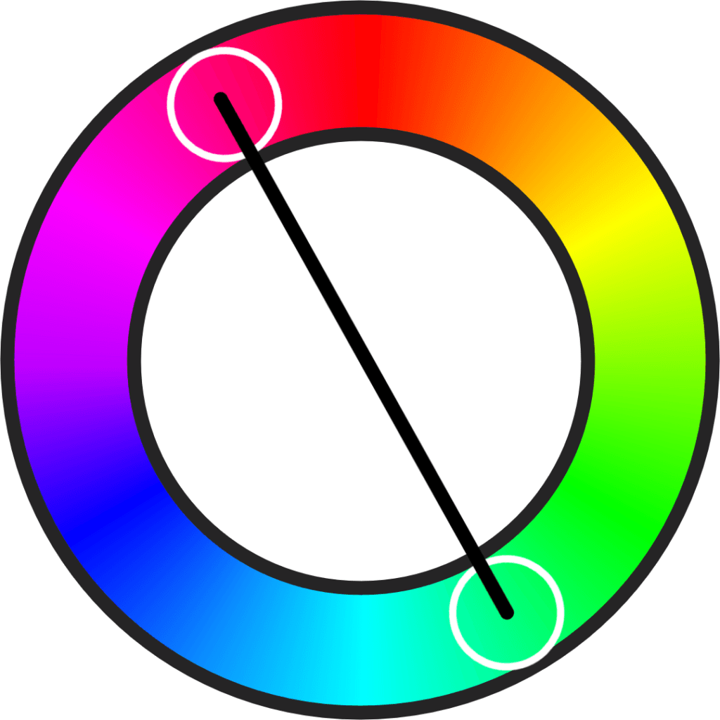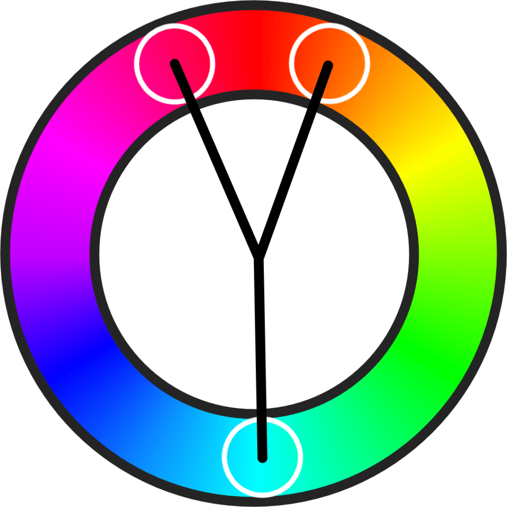 The split complementary relationship modifies the complementary relationship by taking the complementary color and instead splitting it into the adjacent hues. To figure out which colors make up a split complementary, you can draw a narrow triangle over the color wheel or split a line that would approach the complement.