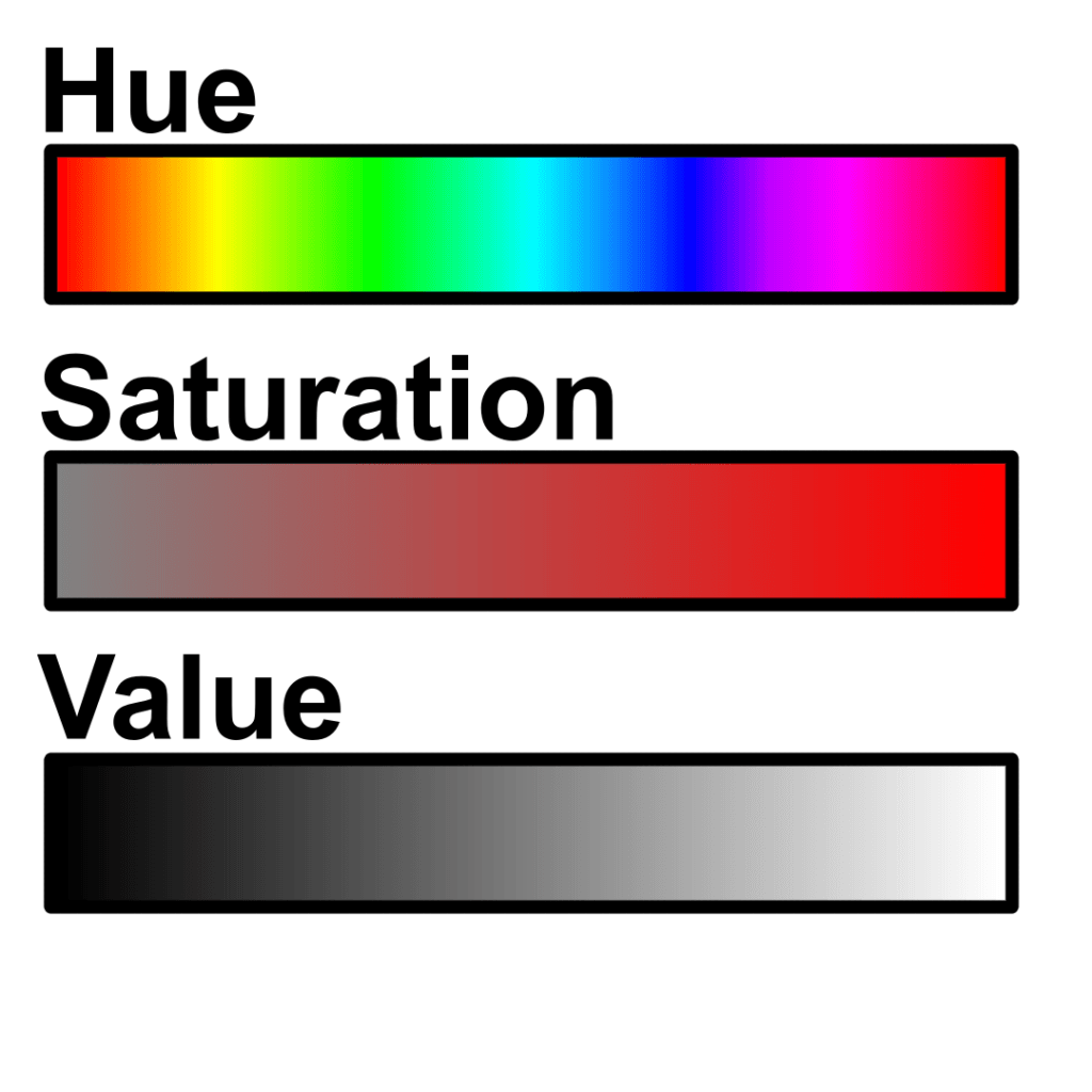 Before we can talk color theory though, it can be helpful to define the characteristics/attributes of color. When talking about colors, we usually describe them using color terms we learned back from pre-school and kindergarten. These terms are useful but lack in specificity when working with color. To get more accurate color names, we might use tools like the Pantone Color Naming System to reference a specific color. However, this guide is more interested in providing the skill of being able to accurately describe color using its attributes over the ability to match a color you see with a color name. To define relations we will be using a color wheel and to define the attributes we will using Hue, Saturation, and Value.