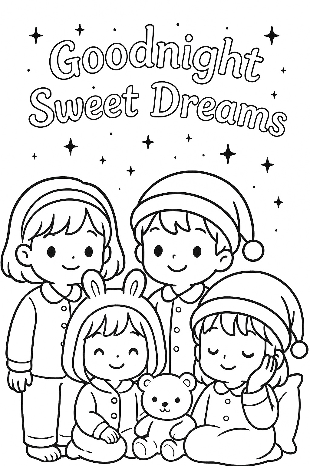 Our Good Night coloring sheets feature soothing images like crescent moons, cozy bunnies, and children tucked into bed in. The calm, nighttime themes encourage relaxation, mindfulness, and emotional expression, making them an excellent addition to a gentle nighttime routine. Coloring before bed helps kids slow down, focus, and express their feelings through art, creating a peaceful transition to sleep.