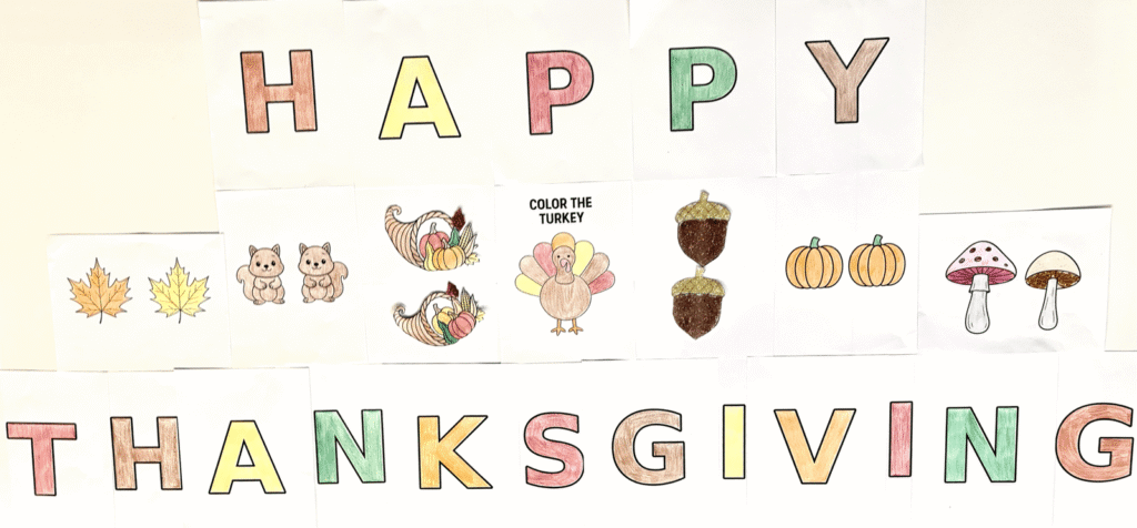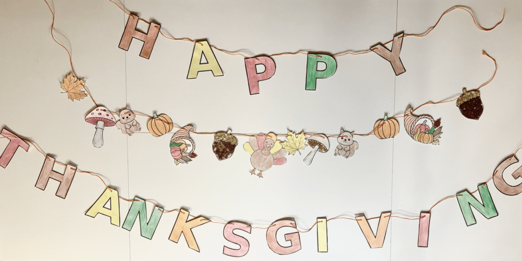 Once the craft is completed, you can tape it up along walls, countertops, and shelves to have a festive decoration for Thanksgiving. Using our other craft printables, with some creativity and imagination the sky is the limit.
