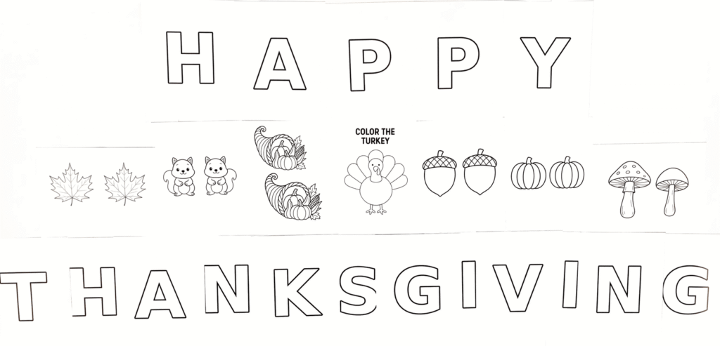 We have created a Happy Thanksgiving Garland using our images to create a fun Thanksgiving activity. You could also make other words like Happy Friendsgiving, grateful, blessed, and thankful. We chose to color with crayons and use glitter making it a child friendly craft. You can use crayons, colored pencils, or paint. We poked a hole with a pen into the empty space of the letters A and P. If you have younger kids, you can just not cut the holes for the A’s and P’s out. If If you wanted to make it more elegant, you could color everything in gold and add glitter. To make it more durable, you can print it on card stock. You could also glue the images onto poster board. We have the entire alphabet in our craft section! To recreate this garland, print the large leaves, large squirrels, large cornucopias, large acorns, large pumpkins, and large mushrooms pages. The turkey image is located on the coloring pages. This is a fun craft for young and old!