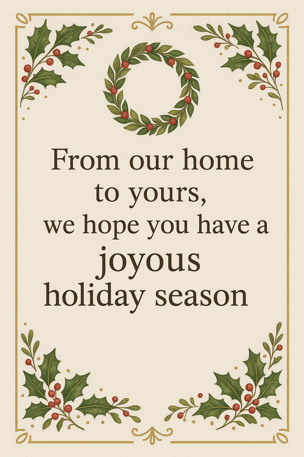 Spread joy, peace, and togetherness this festive season with our free printable and shareable Holiday & Season’s Greetings eCards! These inclusive digital greetings are perfect for sending warm wishes to family, friends, coworkers, and clients—no matter what they celebrate. Whether it’s Christmas, Hanukkah, Kwanzaa, New Year’s, or simply the beauty of winter, our eCards let you share love and light with everyone who makes your world brighter.