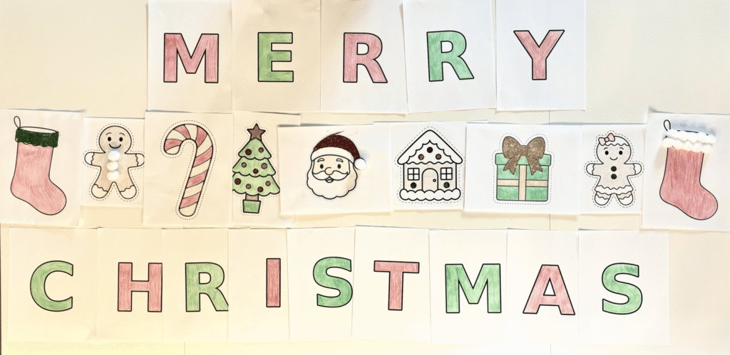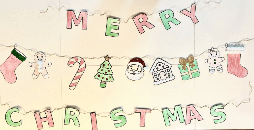 While working on our garland, we began by printing out all of the pieces we wanted to include. We choose to print out the letters to say ‘’Merry Christmas” and printed seasonal decorative craft pieces to bring more Christmas Magic!