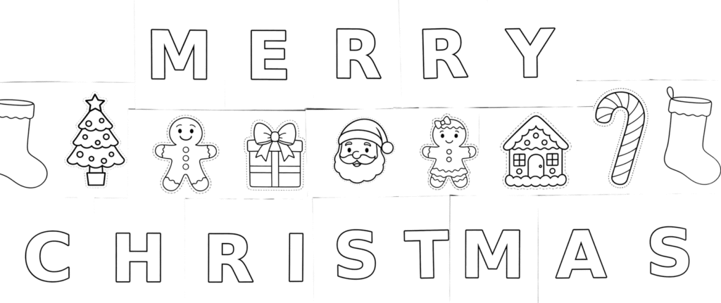 Similar to our Thanksgiving Garland Craft, we have created a Merry Christmas Garland using our images to create a fun family Christmas activity. You could also make other words like Joy, Merry, Blessed, Happy Holidays etc… We chose to color with crayons, add glitter, and pompoms making it a child friendly craft. You can use crayons, colored pencils, or paint. You can add any embellishments you would like. You could use cotton balls to make snow on the stocking and gingerbread house and buttons on the gingerbread girl or boy. Using your imagination, the possibilities are endless! We poked a hole with a pen into the empty space of the letters A and R. If you have younger kids, you can just not cut the holes for the A’s and R’s out. If you want to make it more elegant, you could color everything in gold and add glitter. To make it more durable, you can print it on card stock. You could also glue the images onto poster board. We have the entire alphabet in our craft section! To recreate this garland, print 2 Large Stockings, 1 Large Christmas Tree,1 Large Gingerbread Man, 1 Christmas Present, 1 Santa, 1 Gingerbread Girl, 1 Gingerbread House, and 1 Candy Cane. In the Collage Craft pages, there are several other images that you can use to make your Christmas Garland. Create your own master piece!